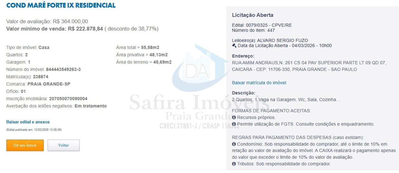 Venda realizada por meio de licitação aberta, com data prevista para 04/03/2026. Aceita pagamento com recursos próprios e possibilidade de utilização de FGTS, conforme regras do edital.