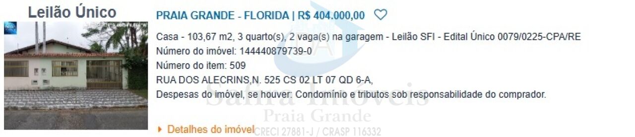 RUA DOS ALECRINS,N. 525 CS 02 LT 07 QD 6-A, FLORIDA - CEP: 11708-170, PRAIA GRANDE - SAO PAULO